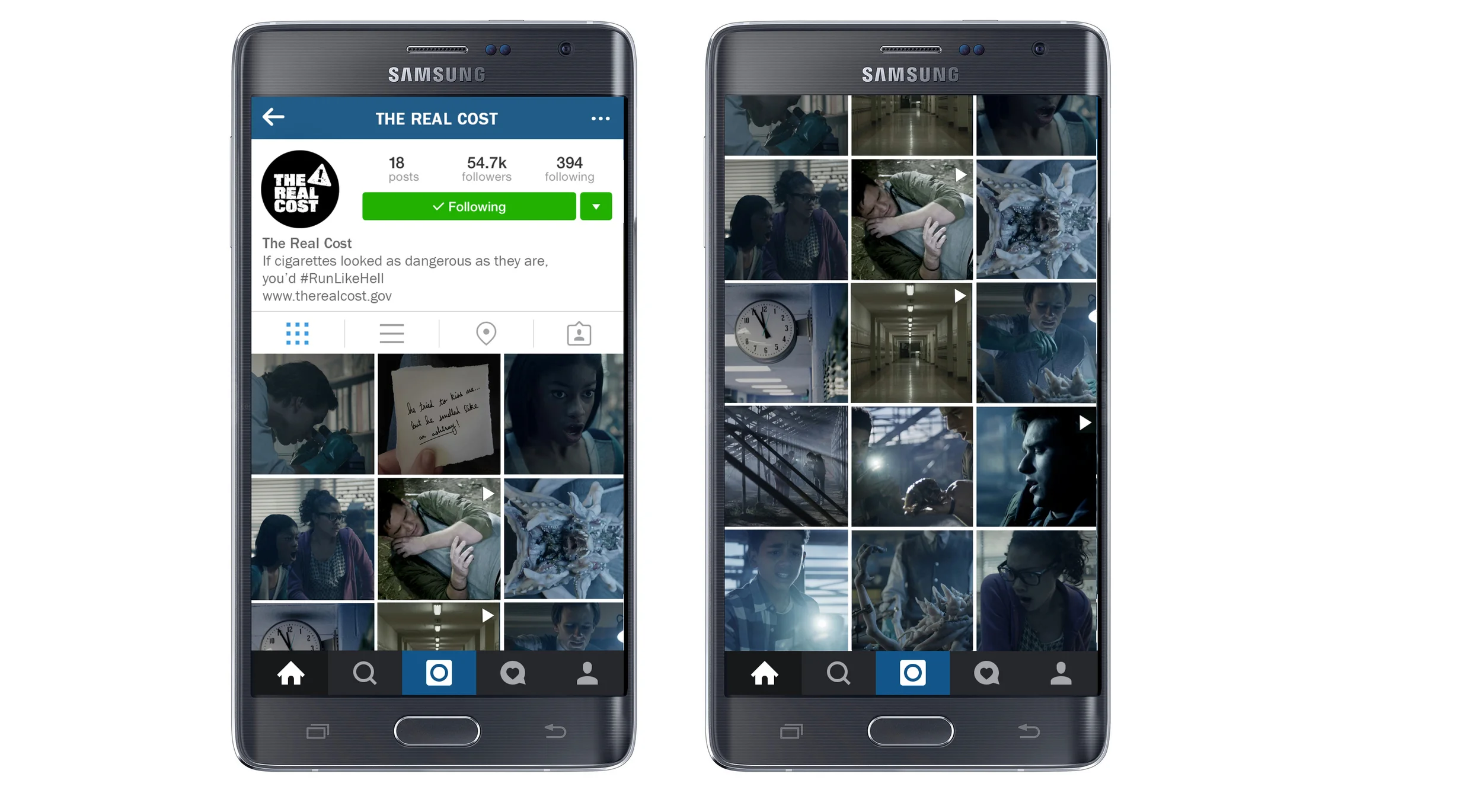 We leveraged the spooky, horror-movie-esque feel of our TV spots to create an entire campaign on Instagram. Creatures, as a metaphor for cigarettes, attack high schoolers. Our Instagram sponsored ads piqued the interest of Instagram users with creepy and mysterious posts that enticed them to tap through to get the whole story. When they did, they could explore a whole world where toxic Creatures take hold of teens and poison them, and a few smoking facts mixed in. Everything here laddering up to the premise that if cigarettes looked as scary as they are, you'd #RunLikeHell.