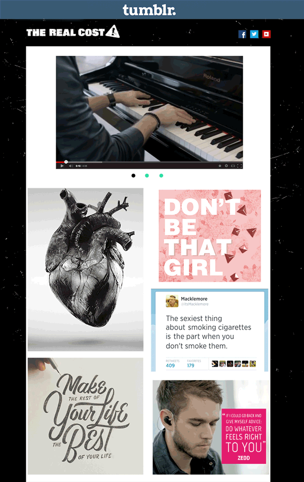 Tumblr applauded the success of this blog, crediting creative and marveling at our earned media. Knowing that anti-smoking messaging isn't typically the type to go viral, especially in a platform where sexy imagery and emo content is king, the success we saw in engagement felt like a huge win.